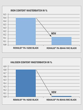 With immediate effect, the masterbatch experts have a new design development in their portfolio: The nigrosine masterbatch ROWALID PA-B044A RHC BLACK (RHC stands for reduced halogen content), which achieves a further reduction in electrocorrosion and reduced interaction with other formulation components compared to other products. An improvement of the mechanical properties after thermal aging is also evident.