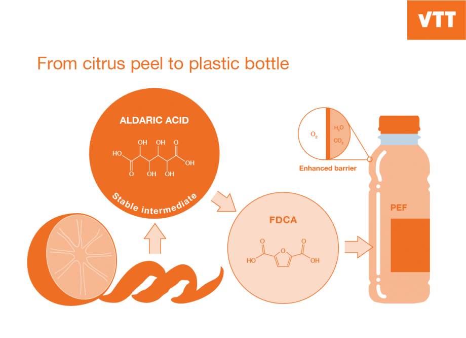 The shift from fossil-based to renewable bio-plastics requires new efficient methods. New technology developed at VTT enables the use of pectin-containing agricultural waste, such as citrus peel and sugar beet pulp, as raw material for bio-based PEF-plastics for replacing fossil-based PET. The carbon footprint of plastic bottles can be lowered by 50% when replacing their raw material of PET with PEF polymers, which also provides a better shelf life for food.