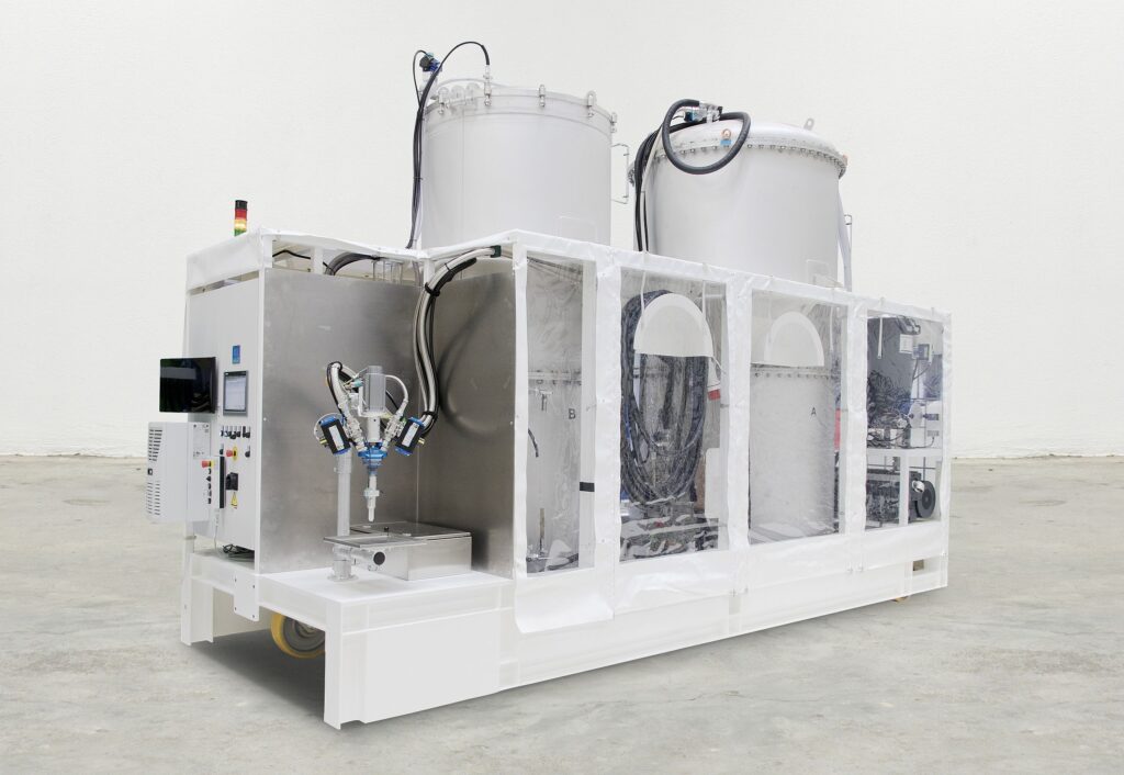 The offline T-EVAC is available in two variants: For direct connection to dosing systems or with an additional buffer tank, which considerably reduces refilling times. In the process, this tank is located between the degassing station and the dosing system (e.g., a NODOPUR VS AR VF Infusion). “It is used for safe temperature-controlled storage of the degassed material under full vacuum and rapid filling of the metering systems,” says Olav Davis. In the inline solution, the T-EVAC is integrated into the dispensing system. System filling and material degassing take place in one step, and machine refueling can be synchronized with the application. The inline T-EVAC requires less personnel and floor space. When operated with only one dosing/mixing system, it is also more cost-effective than the offline variant.
