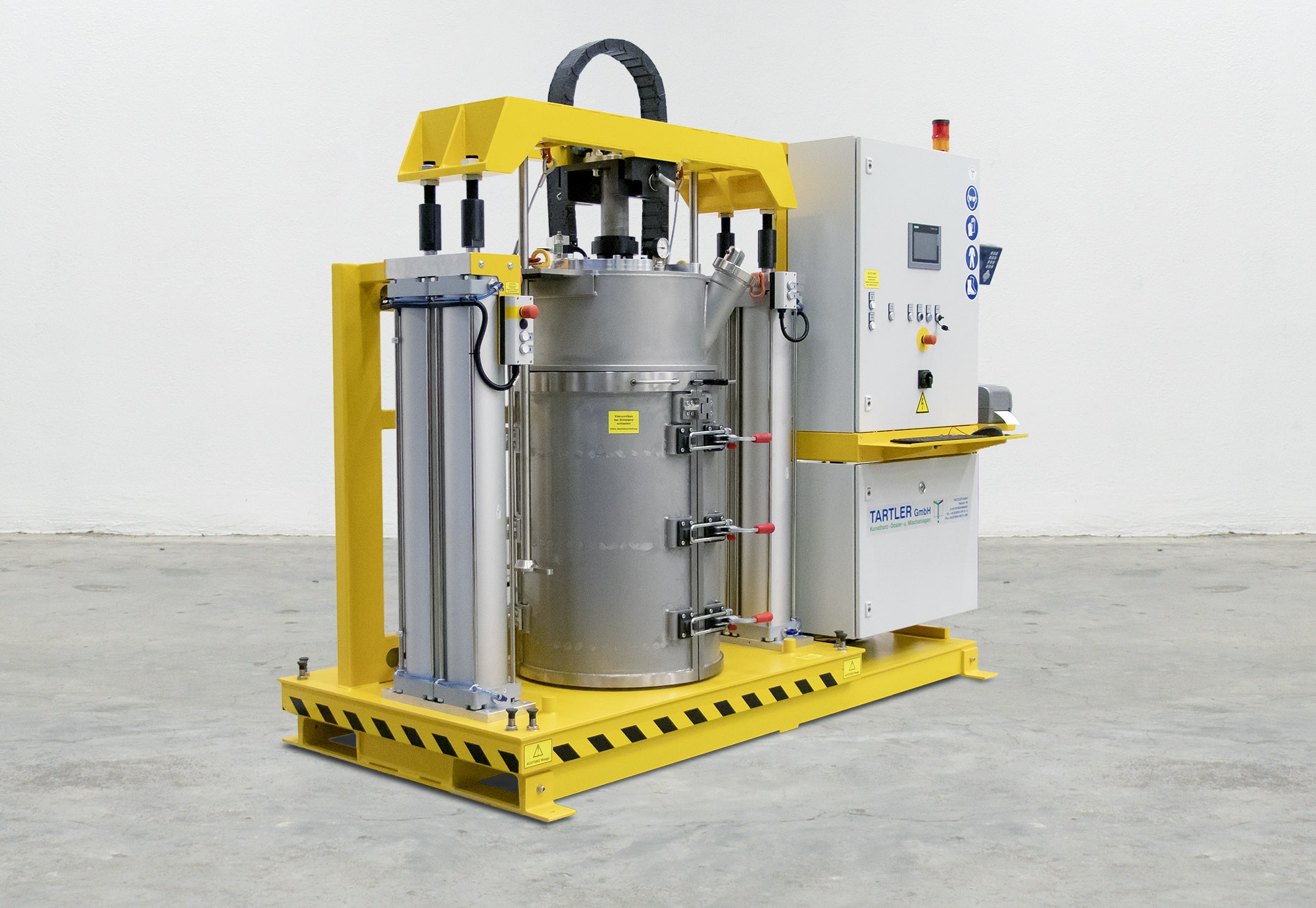 The TAVA 200 F is configured and delivered by SOMATA, a subsidiary of the TARTLER GROUP, to meet customer requirements. The degassing station is available as standard for the air-free filling and transfer of 200- and 50-liter drums, but can also be adapted to other container sizes upon customer request. It consists of a device for clamping and stabilizing the drum, a special combination attachment for synchronized vacuum generation and filling, a vacuum pump, and a control system with touchscreen. All components are installed on a base with a barrel centering plate and are accessible from all sides. While loading the station, positioning a still empty drum, and closing the clamping device can be done manually, the vacuum application to the drum and the almost simultaneous filling of the material are fully automated. After a few minutes, a drum is filled without air and is ready for use in production.