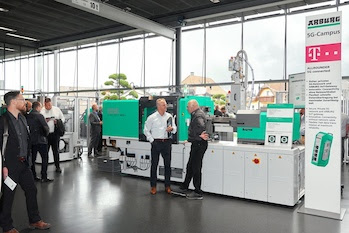 Investing in the machine room of the future: At its headquarters in Lossburg, Germany, Arburg GmbH + Co KG has launched a 5G campus network from Deutsche Telekom. This will enable the manufacturer of injection moulding machines from the northern Black Forest to test innovative applications for its own production – such as autonomous transport systems, industrial robots or automated production processes. In its Customer Center, Arburg is already presenting the potential of the 5G mobile communications standard for digital manufacturing. There, industrial customers from a wide range of plastics-processing sectors, such as the automotive and packaging industries or medical technology, can test digital manufacturing concepts. For this purpose, Telekom has equipped the Arburg Customer Center with eight special in-house antennas that supply the 2,100-square-meter area with 5G.