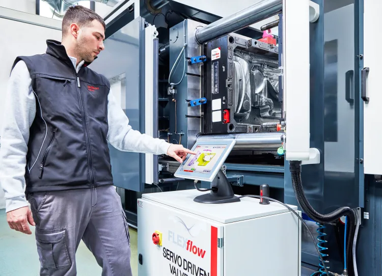 injection moulding, FLEXflow allows individual, sequentially coordinated precise opening and closing of the needles at selectable speeds. This allows the melt flow in the individual hot runner nozzles and the overall volume flow in the cavity to be precisely controlled and the filling process to be optimised over conventional cascade systems. Possible results include not only excellent part surfaces but also a reduction in the required clamping force thanks to the large process window as well as the component weight without compromising quality.