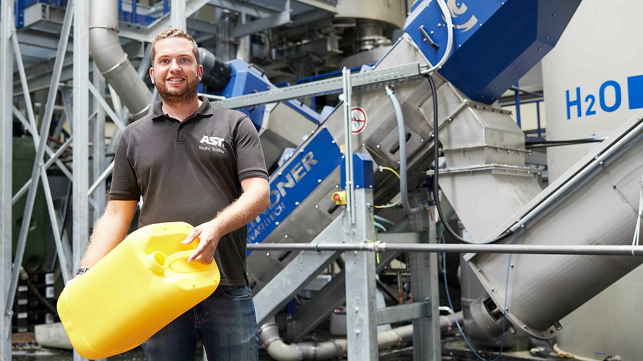 Centre of competence for sustainable product manufacturing The AST Group, in particular the parent company AST Kunststoffverarbeitung GmbH in Erndtebrück, Germany, has been focusing on the circular economy and recycling for some time. Family-run, AST Group is one of Europe’s market leaders when it comes to producing plastic containers for the chemical and food sectors – industries in which high-quality plastic containers and bottles are crucial. From the beginning, the focus was on creating the optimum production loop that would make it possible to increase the recyclate quota for the company’s own products and also use the products made of recyclate in the hazardous and food industries. The stakes were unquestionably high. Nevertheless, a short while later, the first centre of competence for plastics was established and a complete plastics recycling line was installed to process post-industrial and post-consumer HDPE (high density polyethylene). This solution not only significantly contributes to the circular economy, it also ensures the internal supply of raw materials.