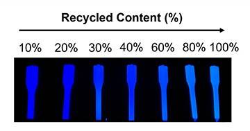 The researchers mixed small amounts of BBS into melted high-density polyethylene (HDPE) and then mixed that with virgin HDPE resin, simulating 0 to 100% recycled-content materials. As the amount of BBS-tagged HDPE rose in the samples, the fluorescence intensity shifted toward a greener hue of blue under a fluorescent light. The marked polymer had unique fluorescence properties, which the researchers suggest would be hard for someone with fraudulent intentions to replicate. Next, the team developed a simple digital image analysis technique that converted the material’s fluorescence into the percentage of recycled content. In tests, the method could identify the recycled content in other real-world polymers, including recycled milk bottles with additives, colored HDPE, polypropylene and poly(ethylene terephthalate). The BBS strategy could be applied to a variety of single-use plastic products without impacting their appearance or quality, the researchers say.
